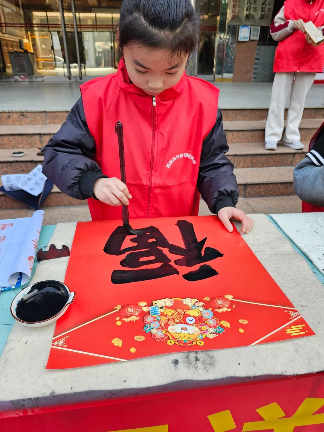 铺纸、蘸墨、起笔......现场的少年会员们挥毫泼墨,他们一笔一划尽显扎实功底,字字饱满圆润,寓意吉祥,一个个包含着新春祝福与美好期许的“福”字跃然纸上。这些“福”字风格各异,有的刚劲有力,有的飘逸洒脱,有的活泼俏皮,吸引着广大市民驻足围观,现场欢声笑语接连不断,一派喜气洋洋的欢乐景象。