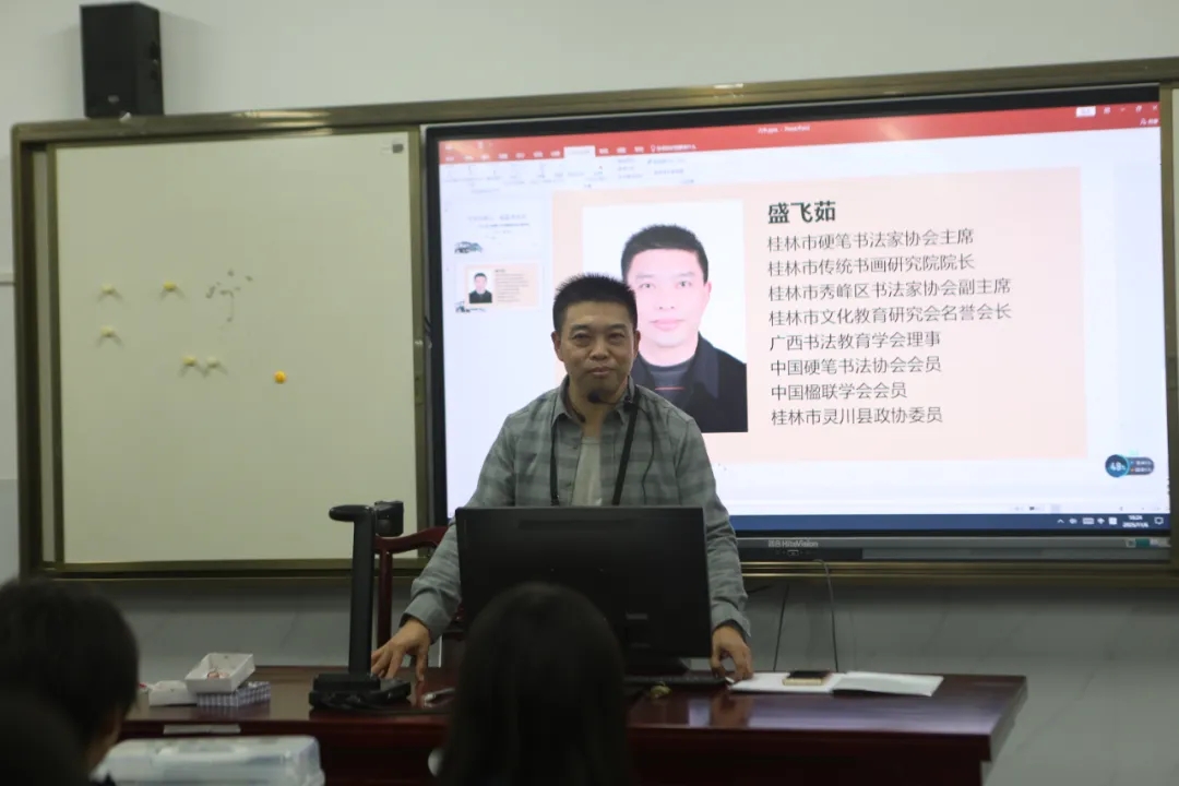 课堂上,盛老师凭借丰富的教学经验,以通俗易懂的语言,从字帖种类、握笔姿势、基本笔画书写技巧、坐姿等基础要领入手,深入浅出地讲解了书法的基础知识。