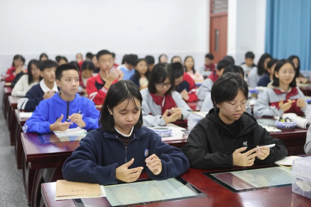 为进一步传承和弘扬书法艺术,帮助青少年学生在横竖撇捺间感悟中华文化精髓,提高学生的书写水平和综合素养,2025年11月13日下午,桂林市硬笔书法家协会主席、桂林市传统书画研究院院长盛飞茹将书法公益课程带进灵川县第六中学,为该校近百名师生带来了一堂生动有趣的书法课——“文化传薪火 翰墨书传承”硬笔书法公益培训。