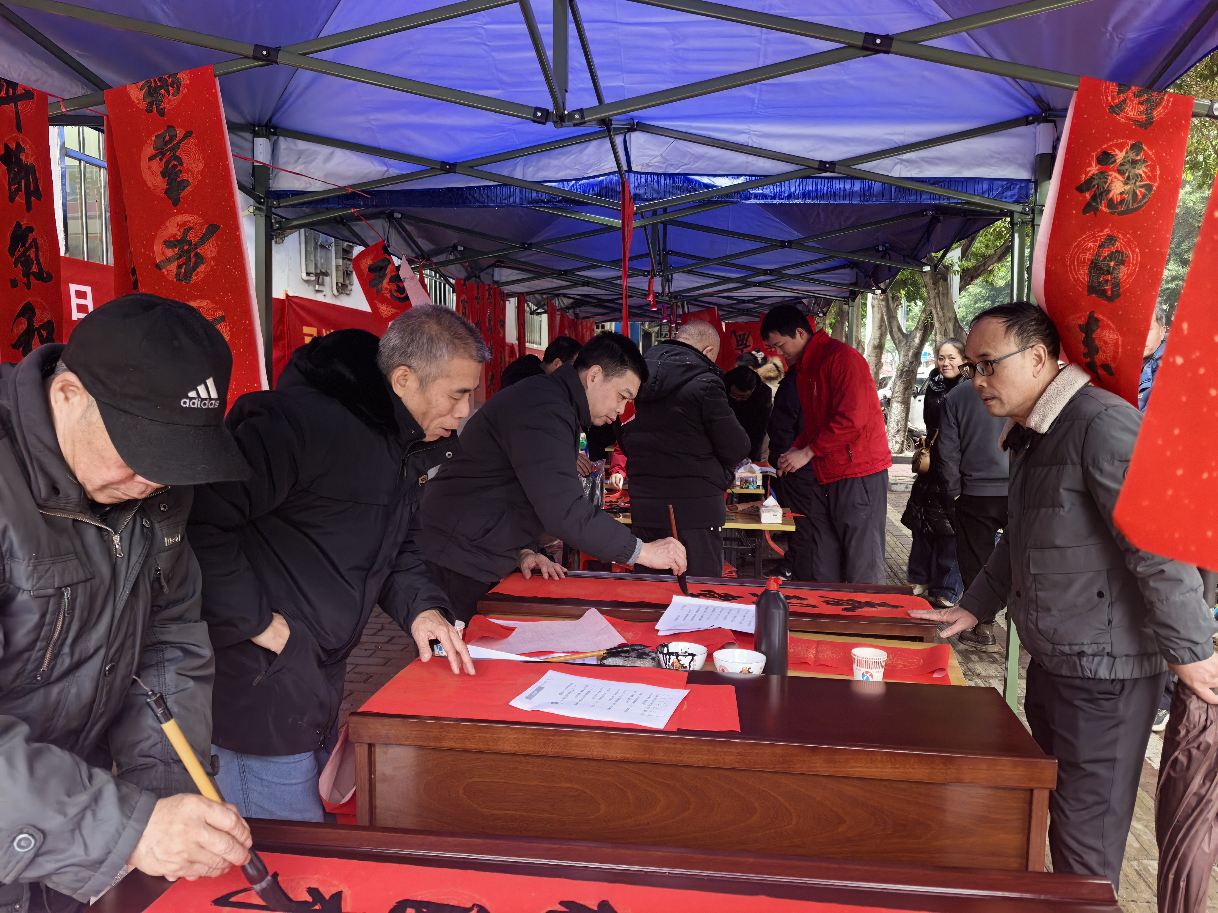 活动现场暖意融融、热闹非凡,红色的春联纸、福字纸整齐摆放,笔墨砚台一应俱全。盛飞茹主席与书法爱好者们凝神聚气、挥毫泼墨,提按顿挫间,一幅幅寓意吉祥的春联、一个个饱含祝福的“福”字跃然纸上。龙飞凤舞的书法作品,既有着“春临大地百花艳,福满人间万户欢”的美好期许,也有“宏图大展前程远,吉星高照事业兴”的奋进祝愿,每一笔都凝聚着对居民的新春祝福,每一幅都彰显着中华传统文化的独特韵味。