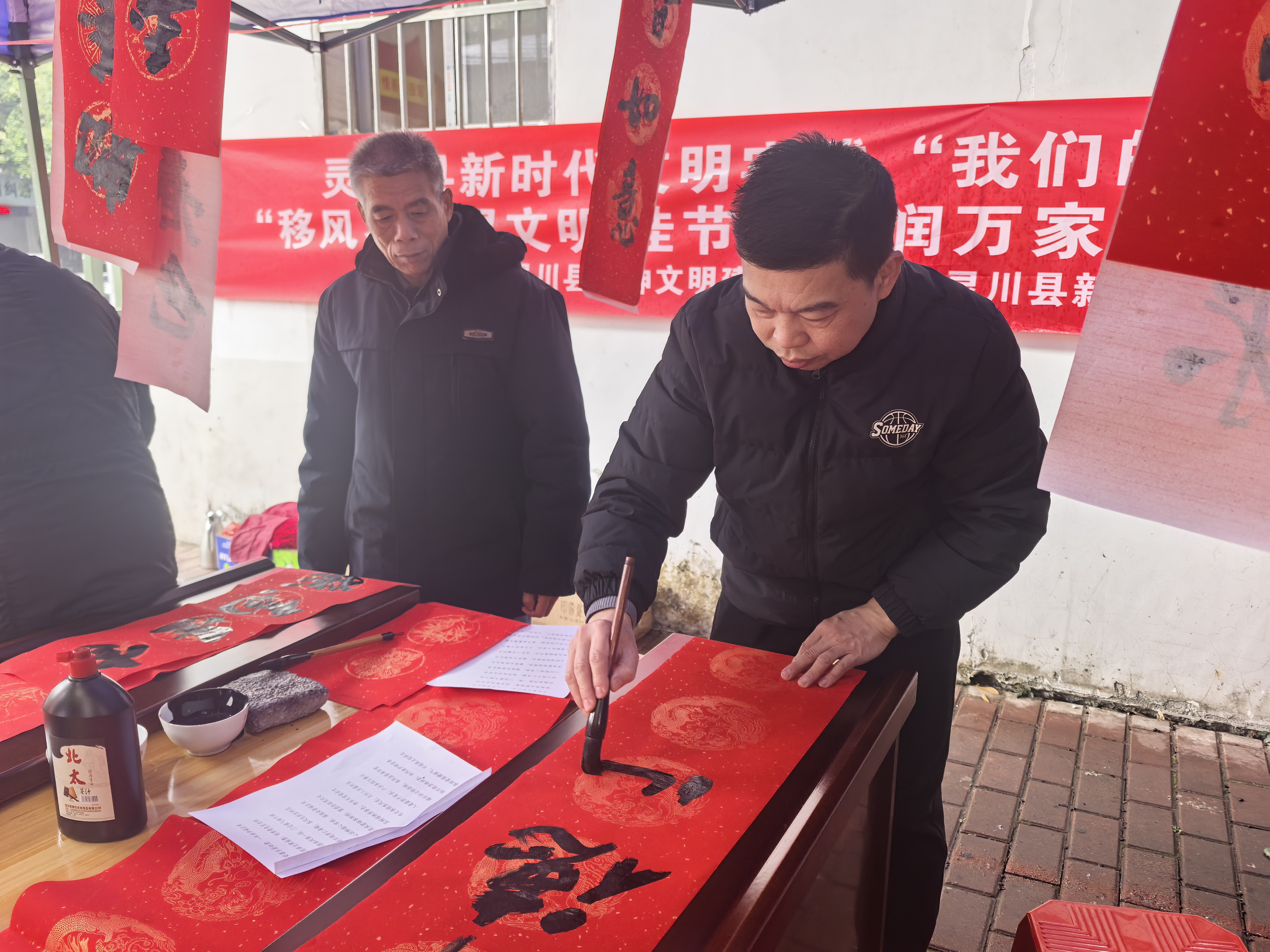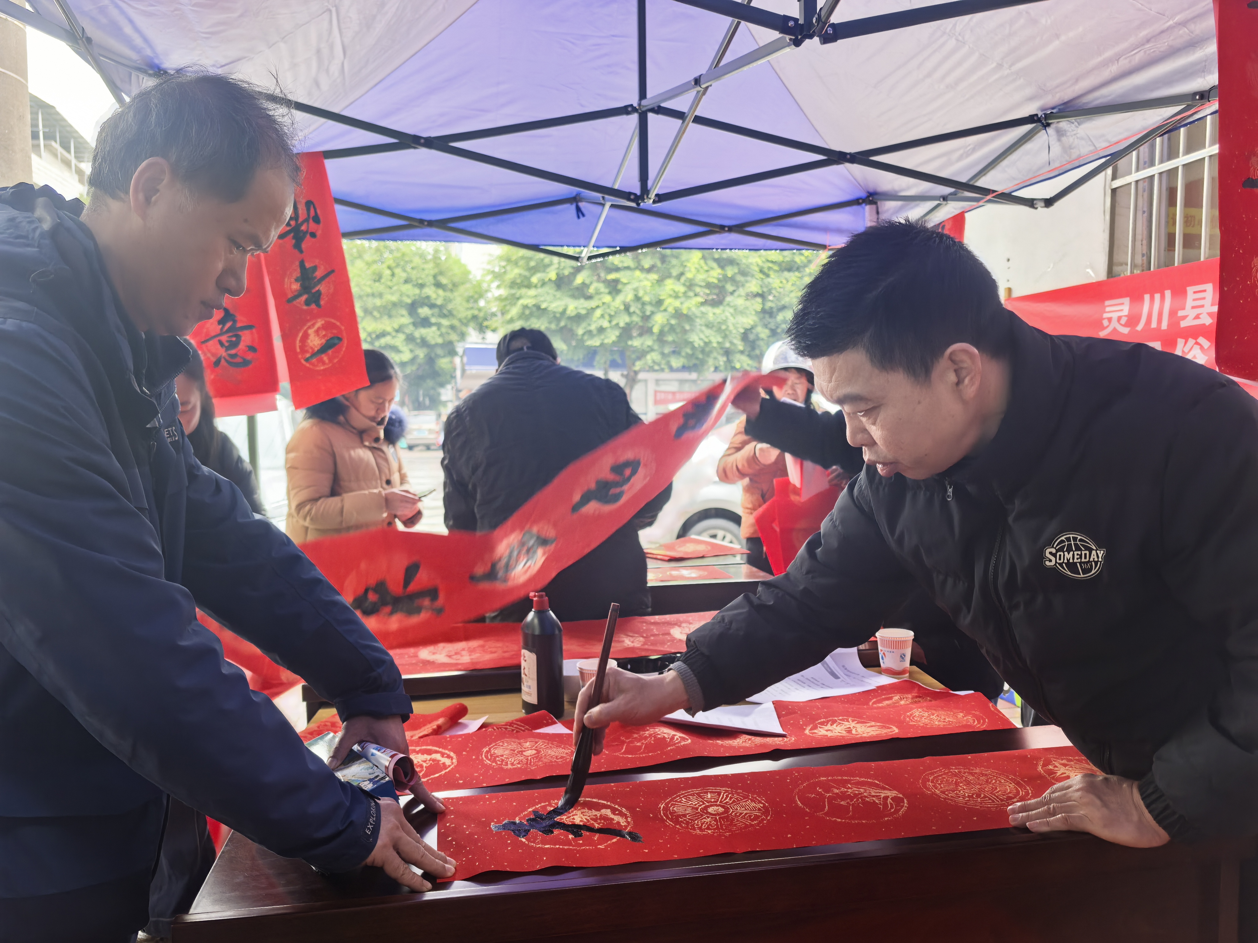 新春将至,年味渐浓。1月26日,新时代文明实践之“我们的节日·春节”——“我们的中国梦·文化进万家 移风易俗倡文明 佳节新风润万家”写春联送祝福活动在灵川县定江镇政府门口开展,本次活动由县委宣传部、县文明办、灵川县新华书店有限公司、县书法家协会联合举办。桂林市硬笔书法家协会主席盛飞茹及多位书法爱好者受邀参加此次活动,以笔墨为媒传递新春祝福,让辖区居民在墨香中感受中华优秀传统文化的魅力,提前迎接新春佳节的到来。