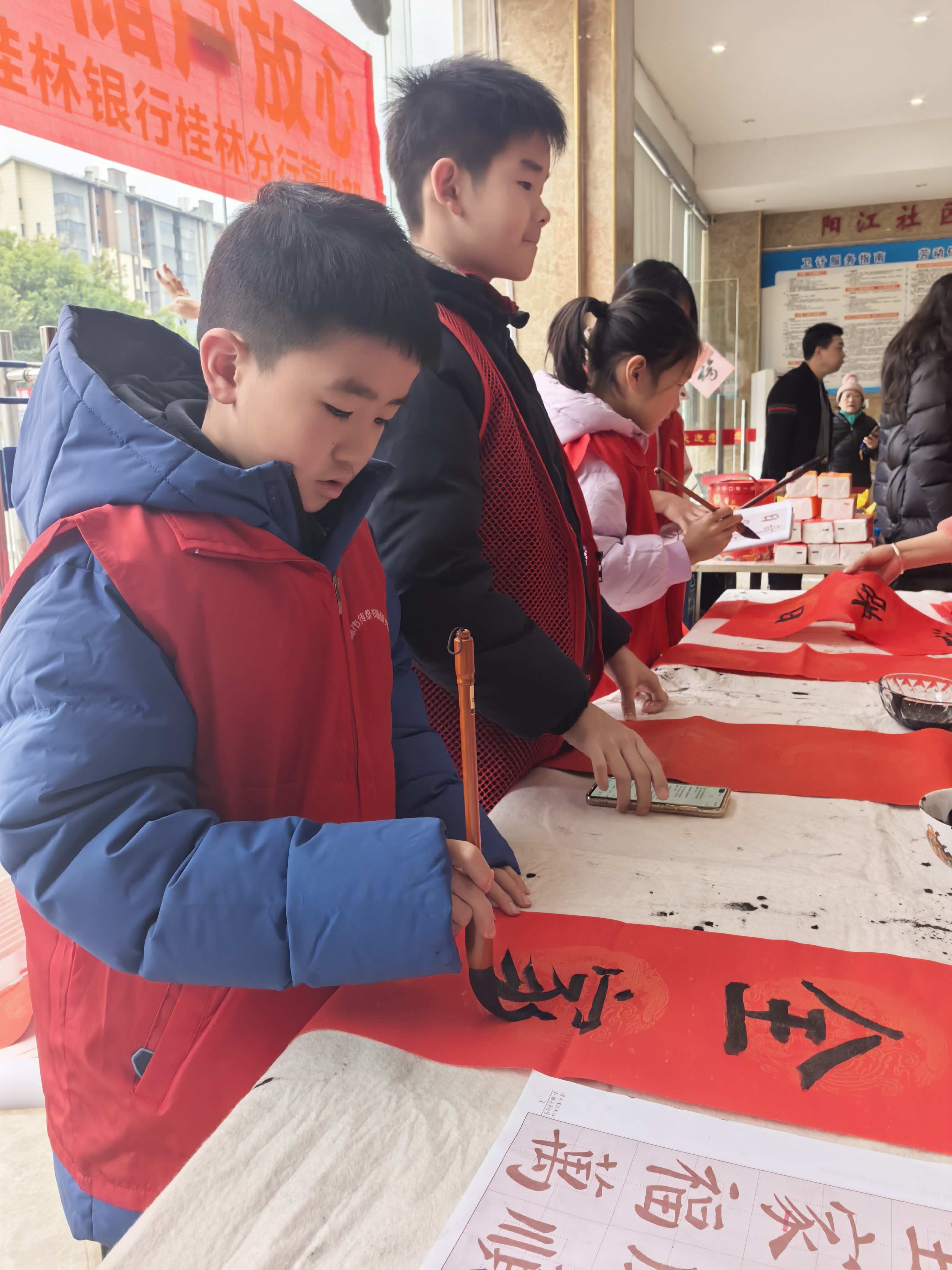 岁暮天寒,年味渐浓。近日,桂林市硬笔书法家协会主席盛飞茹带领协会少年会员,先后走进桂林市阳江社区、灵川县城及灵川梧桐墅小区,开展2026迎新春、写对联、送祝福系列活动,以笔墨为媒传递新春美好期许,让中华优秀传统文化在指尖流转、在社区扎根。
